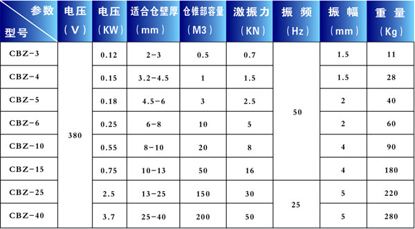 六、CBZ防爆倉壁振動器技術(shù)參數(shù):